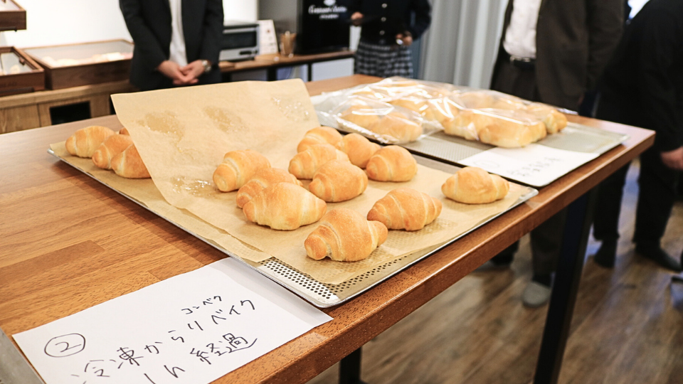 ホテルの朝食会場では、食べる直前にリベイク(再加熱)していただくだけで、外はサクッ、中はもっちり、バターがじゅわっと溢れる「焼きたて」を提供できます。一番美味しい状態で召し上がっていただくために、最適なリベイク方法を何度も検証しました。