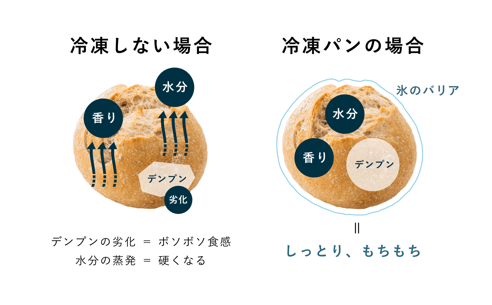 パンは焼きたての瞬間から、中に含まれる水分がどんどん蒸発して乾燥していきます。この乾燥がパンの硬さの原因です。また、パンのおいしさの基となるデンプンも時間とともに劣化していきます。デンプンの劣化はボソボソとした食感の原因となります。この乾燥とデンプンの劣化を防げれば、パンはいつまでもおいしく食べられます。